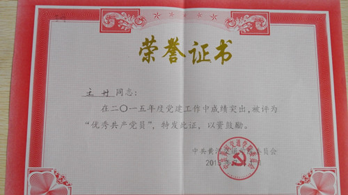 公司王丹同志自2010年转入公司党组织以来,在平凡的工作岗位上严谨求实,勤奋刻苦,兢兢业业,全面的完成各项工作任务;作为一名共产党员,时时处处以党员的标准严格要求自己,在政治理论学习、联系群众和遵纪守法等各方面都较好的发挥着共产党员的先锋模范作用,以饱满的工作热情、扎实的工作作风、积极主动,尽心尽职,勤奋努力,发扬了高新人不怕苦累的无私奉献精神,能较好地完成本职工作任务。在2015年度党建工作中被评为“优秀共产党员”。