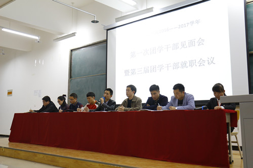 2016年10月26日下午17点30分,yl7703永利集团官网分团委在老员工活动中心102教室召开了第一次团学干部见面会暨第三届团学干部就职会议,莅临本次大会的领导有公司书记赵海发、经理助理李元应、以及全体辅导员老师,参会成员还有第三届全体团学干部、全体员工会新进干事及14级,15级,16级全体班长和团支书。