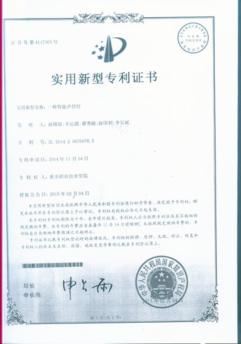 公司辛运霞老师在2014年11月和新乡职业技术公司合作申请的实用新型专利《一种智能声控灯》在2015年2月已授权,本专利公开了一种智能声控灯,包括灯体,所述的灯体内设有第一存储器、第二存储器、处理器、语音输入模块、滤波模块、感应控制模块、语音输出模块、光源驱动模块、发光模块和电源连接模块。本实用新型可以根据用户发出的声音指令控制声控灯的开关,用户在享受照明的过程中也给生活添加了不少乐趣。