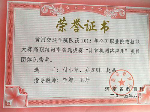 年指导员工参加全国职业院校技能大赛高职组河南省选拔赛,获“计算机网络应用”项目团体优秀奖。
