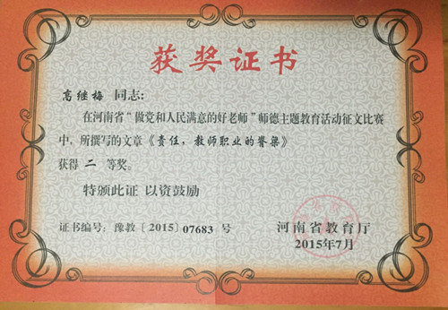 在河南省“做党和人民满意的好老师”师德主题教育征文比赛活动中获得二等奖
