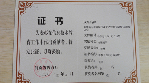 年参与河南省教育厅组织的河南省信息技术教育优先成果奖中通过申报主持课题《新建地方本科院校课堂教学质量评价体系的研究》,荣获应用成果三等奖