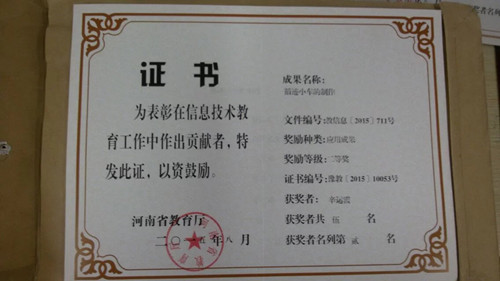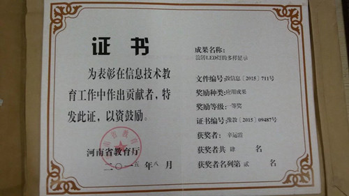 在2015年8月,辛运霞老师参与设计和制作的旋转LED灯的多样显示。获得河南省信息技术教育优秀成果奖一等奖。通过产品设计方案的论证及各个功能模块单元和整体电路原理图的设计与优化,经过电路板的制作;电子元器件的焊接;芯片的程序的编写与调试;整个电子产品电路的检测;检验产品的效果。最终实现通过LED可显示多种效果,并且可以旋转。同时,辛运霞老师也参与设计和制作的循迹小车的制作。获得河南省信息技术教育优秀成果奖二等奖。通过产品设计方案的论证及各个功能模块单元和整体电路原理图的设计与优化,经过电路板的制作;电子元器件的焊接;芯片的程序的编写与调试;整个电子产品电路的检测;检验产品的效果。最终实现小车可以按照预定的轨道行走。