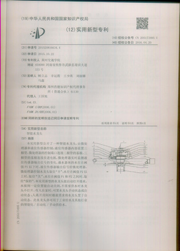 公司辛运霞老师在2014年11月和顾立志、王少英等人合作申请的实用新型专利《智能水龙头》在2016年4月已获得授权。本专利公开了一种智能水龙头,由微处理器和液位传感器控制,液位传感器内部设置三极管,微处理器的控制端口连接三极管的基极,三极管的基极连接步进电机,微处理器实时监测液位传感器输出信号的变化。本实用新型的水龙头能自动打开接水,水接到一定位置能自动关闭,不需要供水时水龙头不打开。有人在家时,可置水龙头手动状态或自动状态;人离开房间时根据需求将水龙头置于自动状态。此水龙头亦可用于工业给水及其他行业的智能化/自动化/手动供给水。