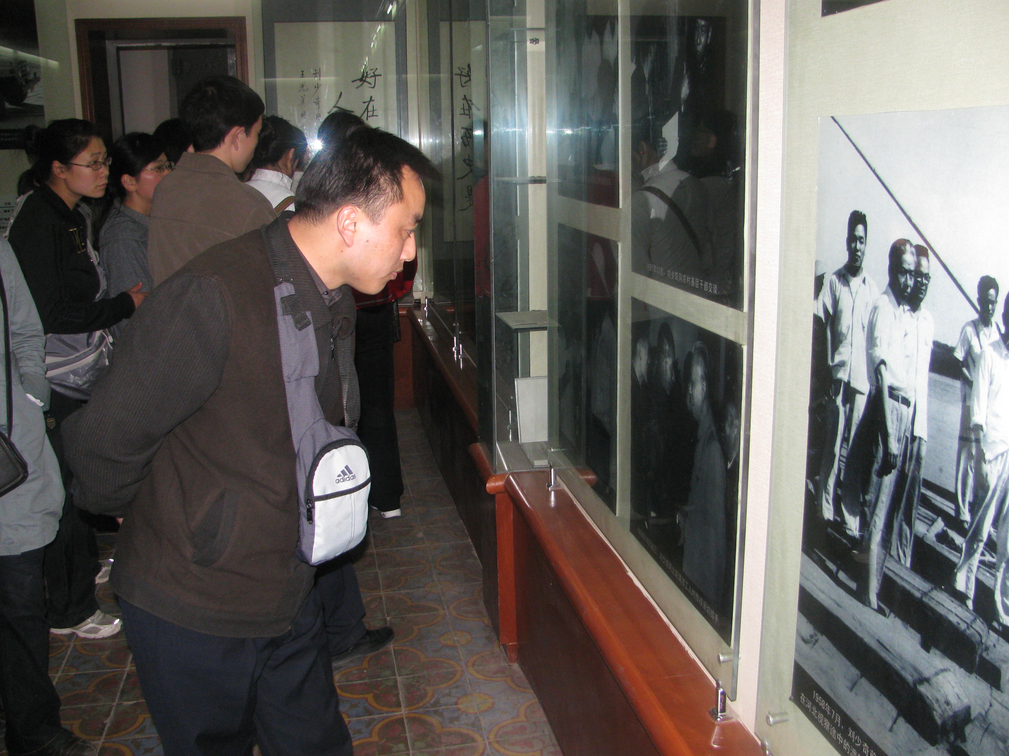 纪念馆里展览着刘少奇生平的照片、衣服以及他临终时所用的床、担架等。跟随着解说员的讲解,党员们怀着无限沉重的心情参观着这些遗物。纪念馆的墙上留有刘少奇“记共产党员修养”的部分手稿,党员同志们在现场进行了认真的研读。