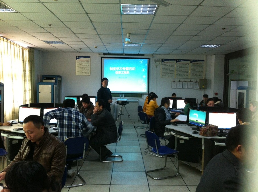 此次专题活动采用创新的工作方法,充分利用我系网络实验平台,在图书科技楼8楼网络实验室进行,此次由赵海发主任主持,采取大家先自由学习,中间相互探讨,最后由赵主任进行强调的模式进行学习,大家在学习过程中都认真仔细地阅读,有的低头沉思,有的拿笔记下,有的相互探讨。