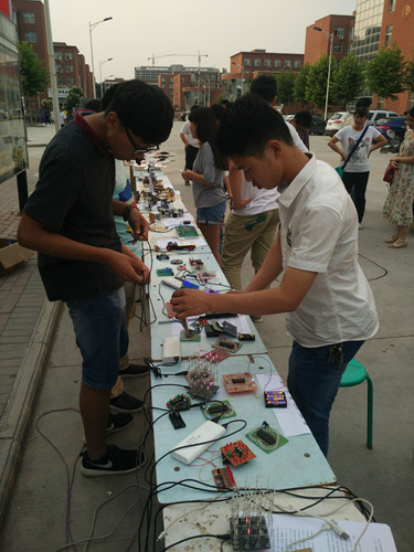 为了推动校园的文化建设,丰富、活跃、充实师生的校园文化生活,更是为了发挥同学们的想象、设计、发明制作的动脑、动手能力和展示聪明才智,yl7703永利集团官网机械科研社和创客小组在致远楼前举办电子工艺品展览活动。
