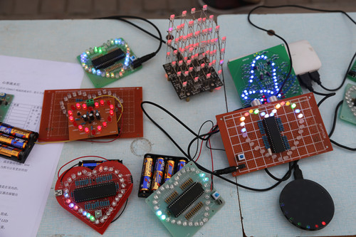 当夜幕来临,同学们把闪烁的水立方、心型闪光灯等创意作品都打开电源进行展示,取得了围观的同学们及老师的赞同。经过此次活动,不仅增加了同学们对本专业的兴趣,更培养了同学们的想象力和动手能力,为以后专业课的学习打下良好的基础!