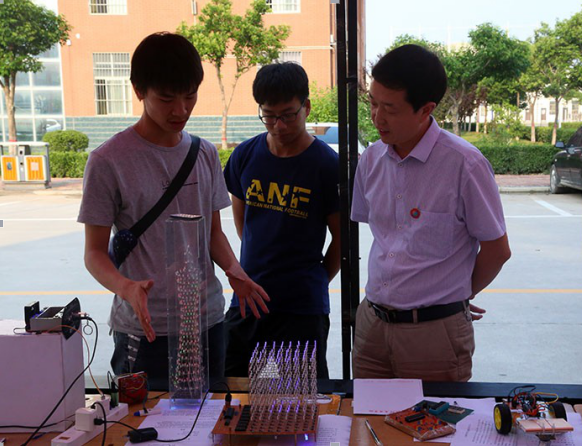 本次大赛主要以展览同学们设计的电子机械作品为主,不仅展现了同学们自己动手的实践能力,更是体现出了yl7703永利集团官网学以致用,培养应用型人才的理念。展览上,同学们将各自的科研成果整齐的摆放在桌子上,它们种类众多,样式繁杂。有智能蓝牙遥控小车,模拟交通信号灯,还有创意新颖的心率测试仪等科研作品。公司党总支书记赵海发、副书记李元应莅临现场,观看同学们的科研成果,并作出指导和评价。每一位设计者都给在场的师生详细的介绍自己的作品,更好的了解其功能和作用。听了同学们的详细介绍,在场师生都对同学们的创新能力赞不绝口。赵海发表示,“通过这个系列活动,使同学们的能力得到了充分的展示,今后yl7703永利集团官网也将不遗余力地把应用型人才培养推向新的高度贴近市场培养,符合各种专业行业需求的专业技术人才。”给了同学们最大的支持和肯定。